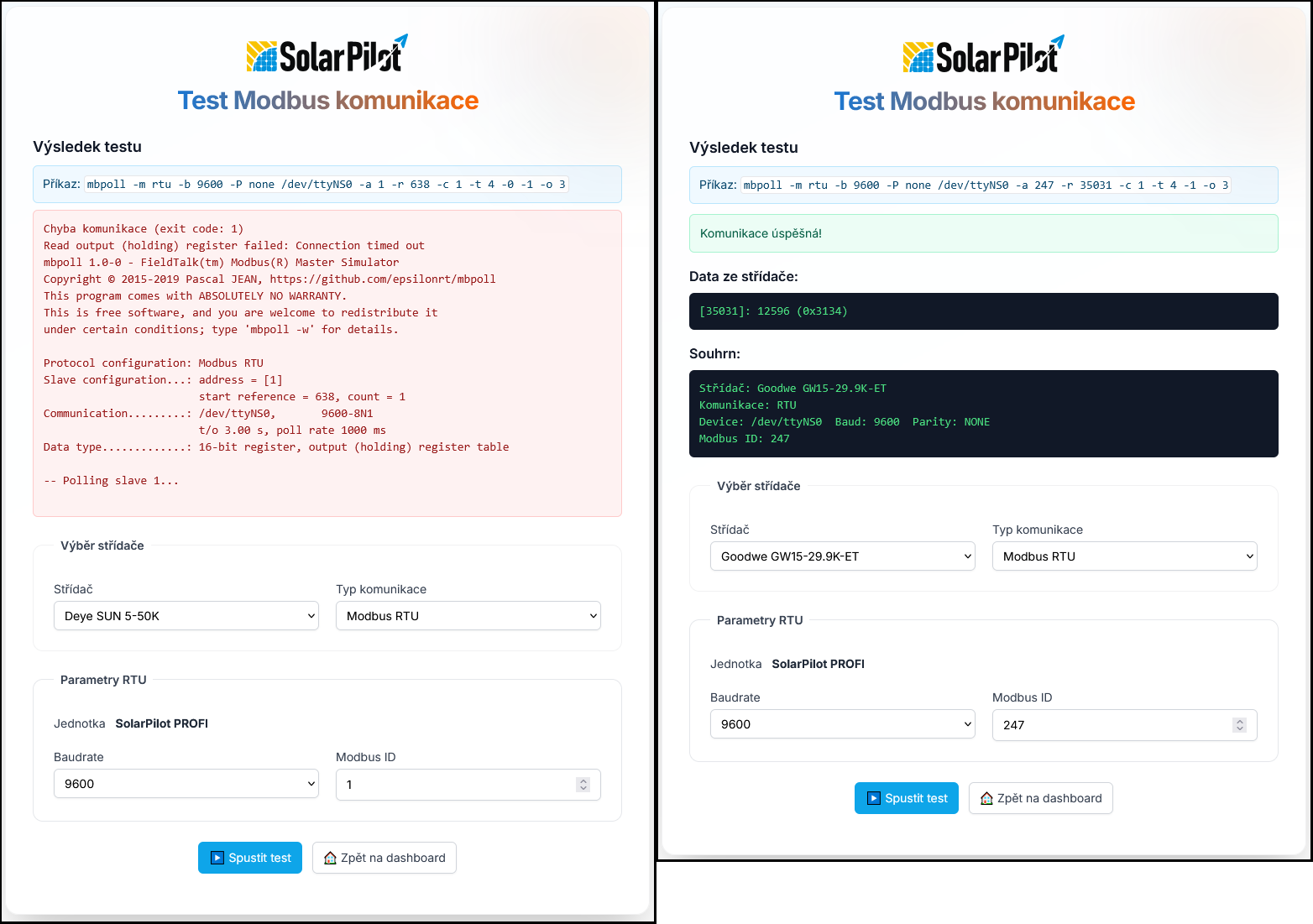 - na stránce pro test komunikace, po výběru správného střídače a odpovídajícího typu připojení, je možné spustit test komunikace tlačítkem – Spustit test (