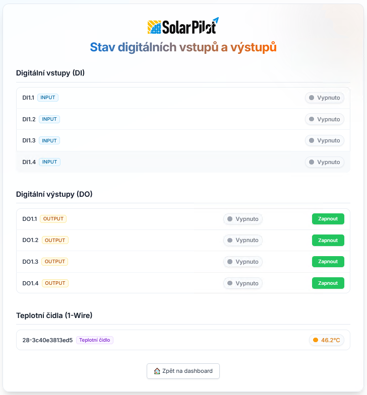 - zobrazí se stránka s přehledem aktuálního stavu vstupů/výstupů a případně i připojeného teplotního čidla