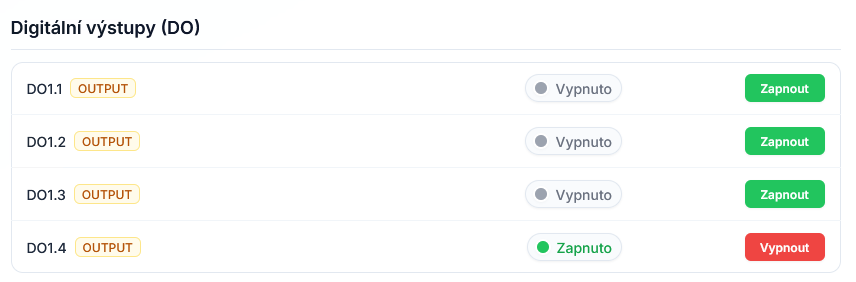 - digitální výstupy je možné (např. v rámci testování) zapnout nebo vypnout příslušným tlačítkem (dle aktuálního stavu digitálního výstupu) – (
