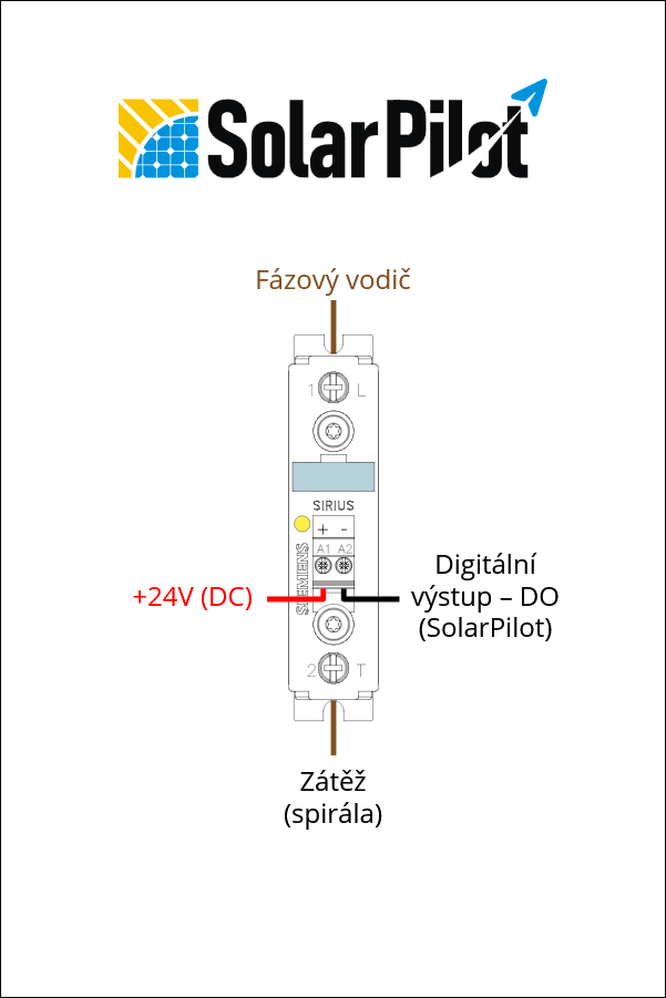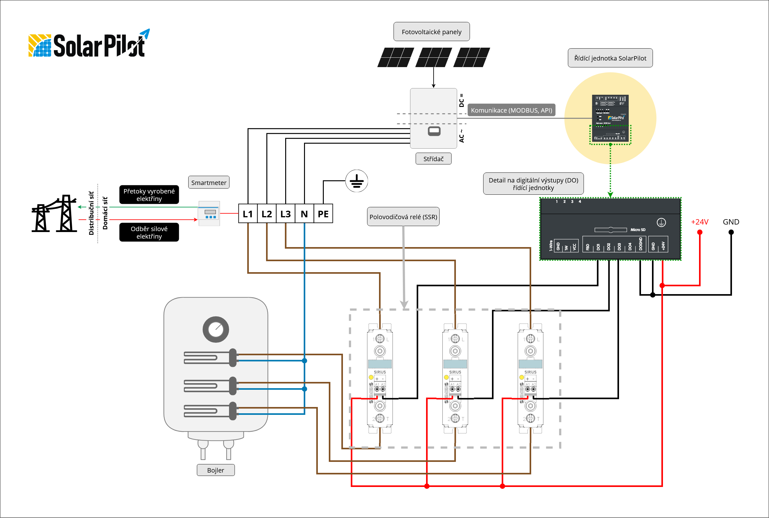 Každá z fází elektrické soustavy (L1, L2, L3) je připojena k topné spirále přes samostatné polovodičové relé, které může být za pomocí digitálního výstupu (DO) spínáno/rozepínáno na základě dalších nastavených podmínek (SPOTové ceny nebo přetoku) automatizace pro bojler/akumulační nádrž v systému SolarPilot.