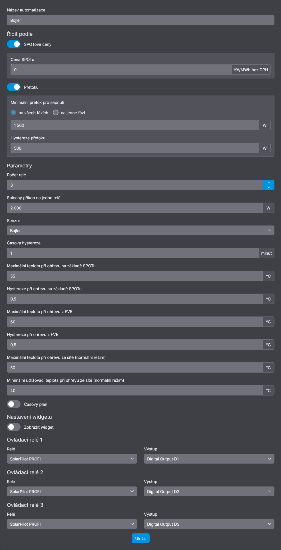 V systému SolarPilot je pro ohřev bojleru/akumulační nádrže určena automatizace s odpovídajícím názvem – Bojer / akumulační nádrž. Nastavení je dostupné v detailu konkrétní FVE (Nastavení FVE –> Automatizace).