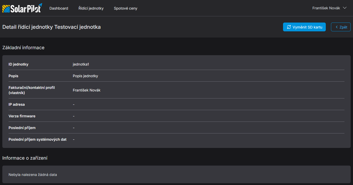 Detailní informace o řídící jednotce.