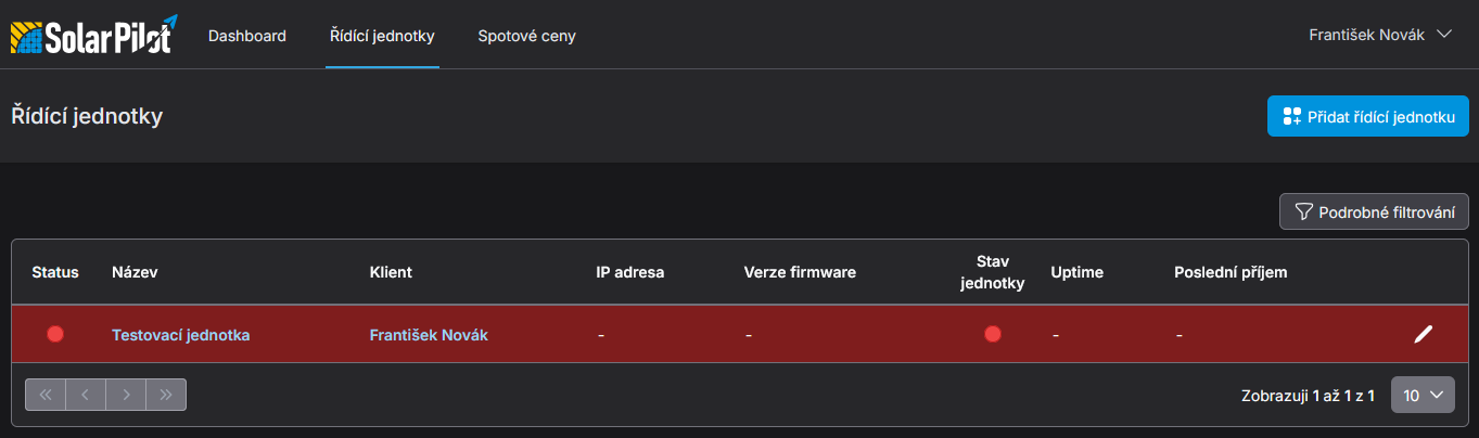 Zaevidovat a přidat další řídící jednotku k FVE je možné po stisknutí na tlačítko Přidat řídící jednotku ().