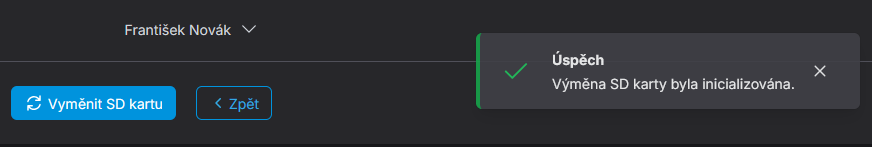 Zobrazené hlášení o úspěšném provedení výměny SD karty