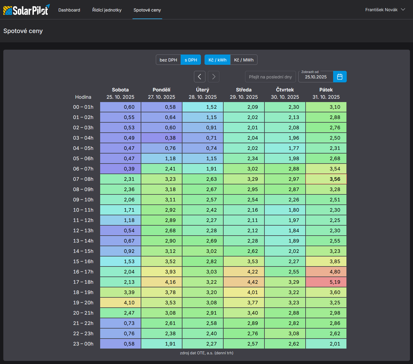 Přehledná tabulka spotových cen spotového denního trhu, která je rozdělená dle dnů a hodin včetně možnosti zobrazení historie.